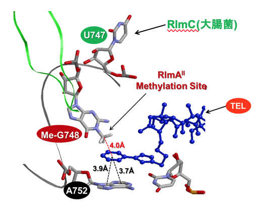 しかしながら、RlmCDによるU747のメチル化のメチル基は、TEL結合部位と真逆をむいていました(右図)。