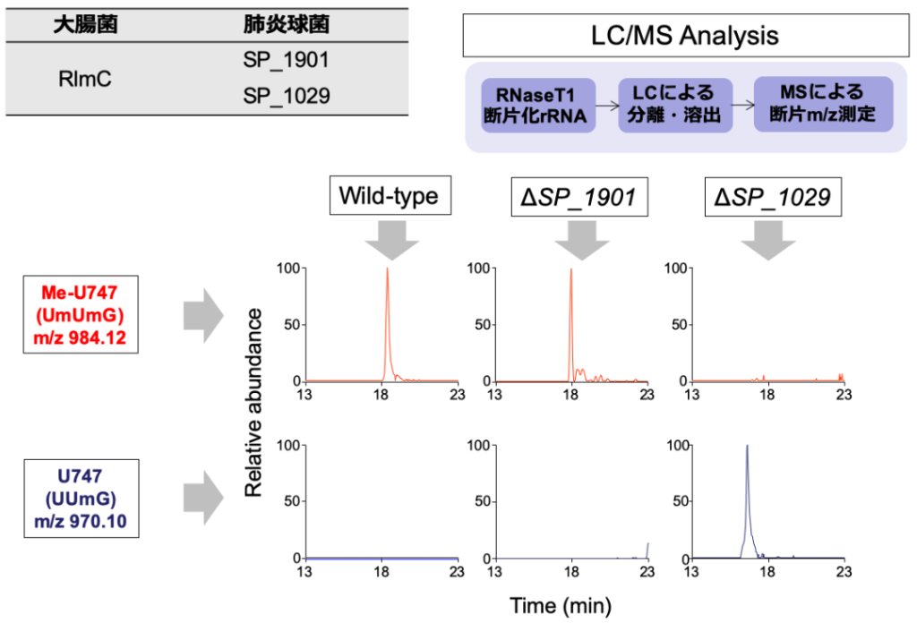 そこで、大腸菌ではG748周辺に747番目のウラシル(U747)のメチル化などの複数の修飾があることに着目し、肺炎球菌においてもG748周辺に修飾が存在して、それら複数の修飾がまとまって機能を発揮している可能性を考えました。