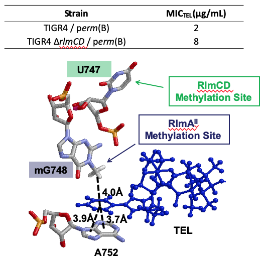 学部4年生の研究により、肺炎球菌に抗生物質:テリスロマイシン(TEL)がよく効く理由として、23S リボソームRNA 748番目のグアニン (23S rRNA G748) のメチル化が重要であることが分かりました。しかしながら、肺炎球菌にとっての役割は不明なままでした。