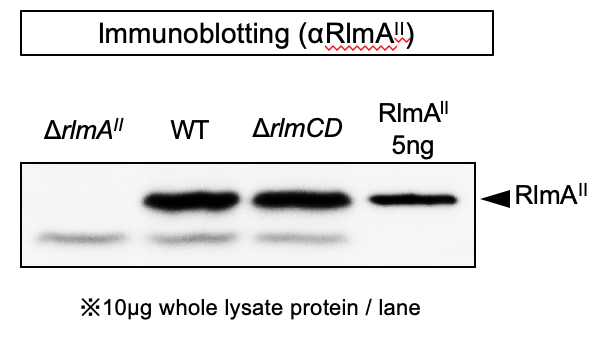 その理由を検討するため、RlmCD欠損株でRlmAIIのタンパク量をウエスタンブロッティングによって調べた結果、いずれも野生株と同程度でした(下図)。