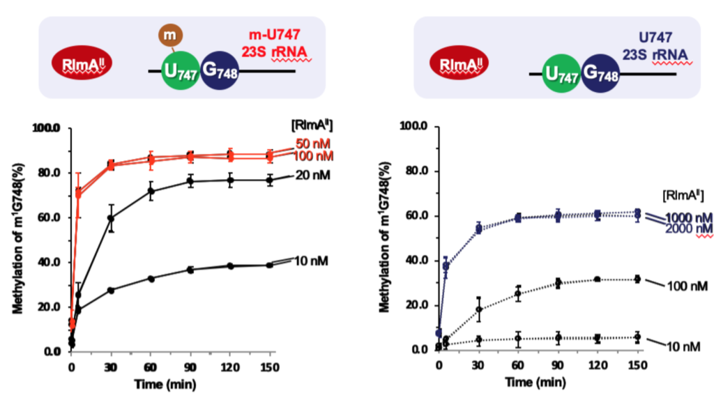 更に、様々な酵素濃度に対するメチル化の時間変化を調べたところ、酵素反応測度論の観点から、RlmCDによるU747メチル化はRlmAIIの基質認識を促進することが証明できました。
