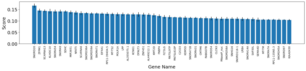 plt.rcParams["figure.figsize"] = (20,3)plt.bar(x, y, yerr=std)plt.xticks(x, fontsize=10)plt.xticks(rotation=90)plt.xlabel('Gene Name')plt.ylabel('Score')plt.show()