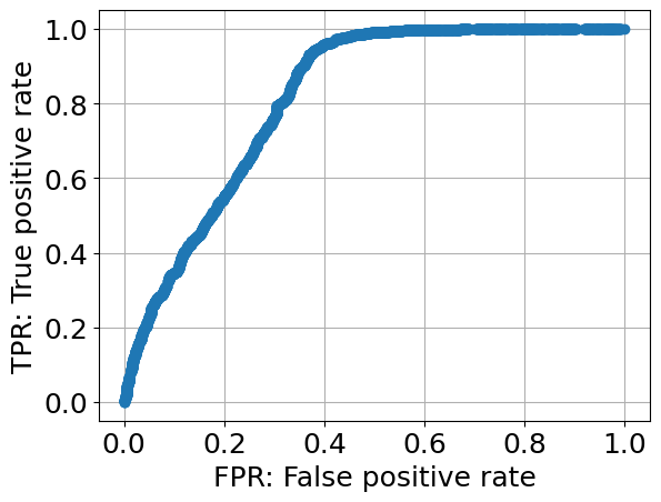 plt.plot(fpr_all, tpr_all, marker='o')plt.xlabel('FPR: False positive rate')plt.ylabel('TPR: True positive rate')plt.grid()