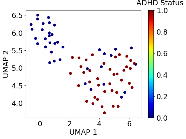 特徴量を絞ることでUMAPではADHD患者と健常人がかなり明瞭に分かれました。