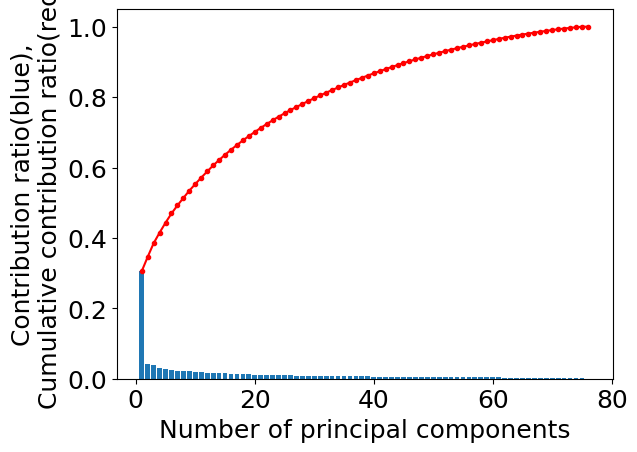 plt.ylabel('Contribution ratio(blue),\nCumulative contribution ratio(red)')  # 縦軸の名前。\n で改行しています