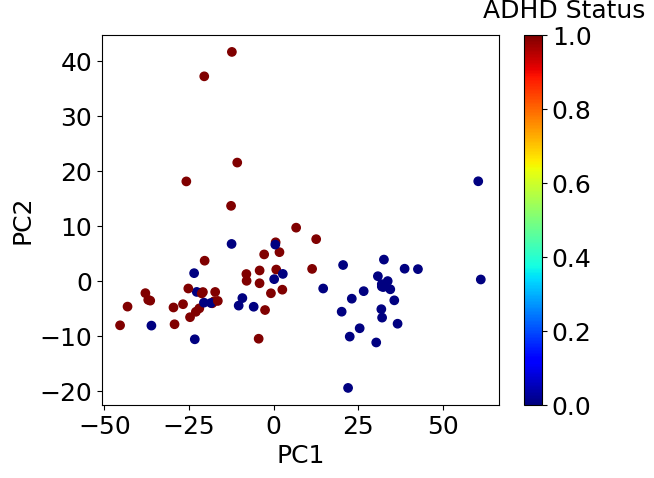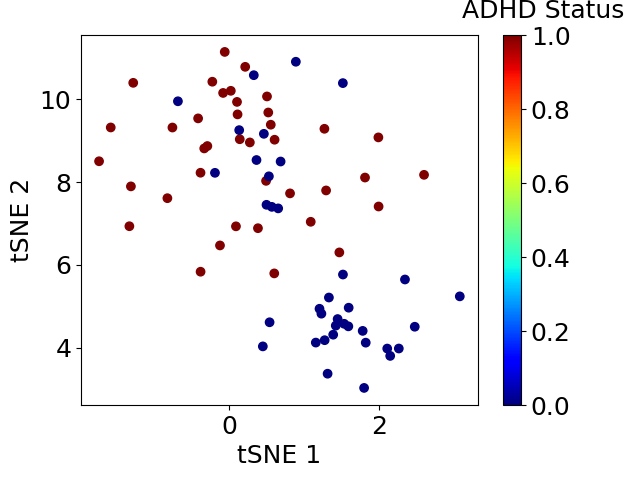 まずは次元削減を実施し、現在のデータのまま十分にADHDであるか判定できそうか大雑把に調べます。