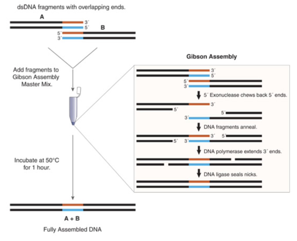 Gibson Assembly システムは三つの異なる酵素反応を一つのバッファーで行うことで、複数のDNA断片を一括に繋ぎ合せることができるシステムです。