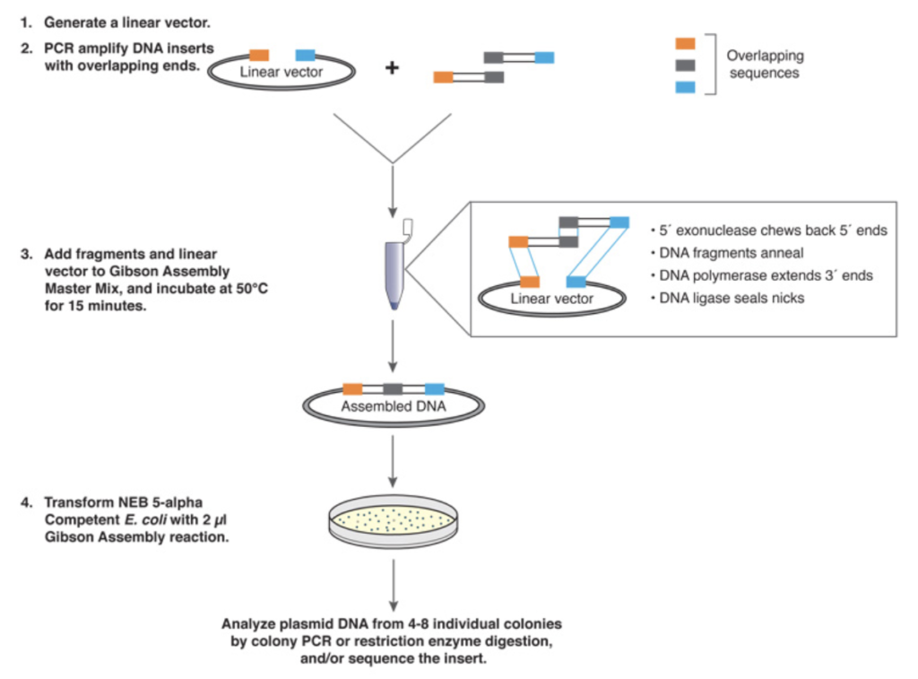 - PCRを使って目的のDNA断片を増幅します。増幅されたDNA断片は、ギブソンアセンブリーで組み合わされる予定の他のDNA断片と20塩基以上のオーバーハングを持つことが望ましいです。