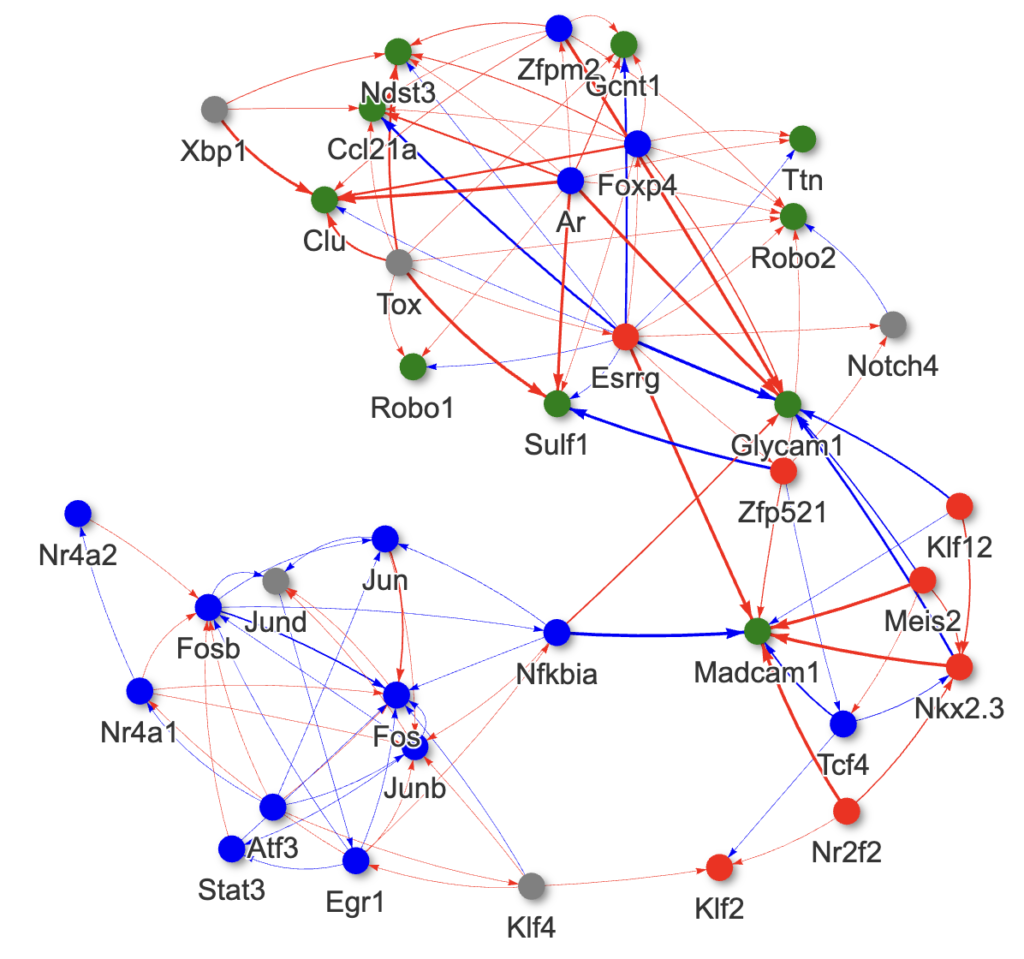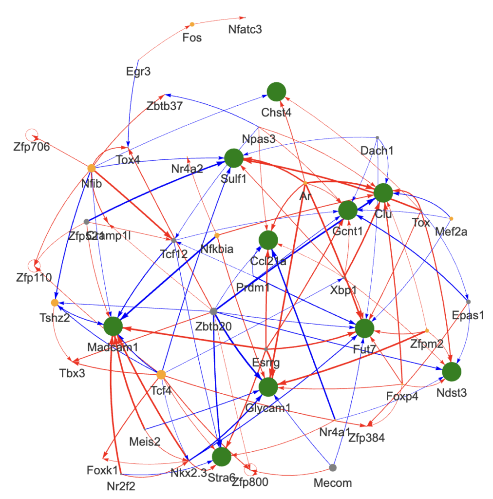 以下は、ある転写因子のmRNA量をその他の転写因子の線形結合でモデル化しLASSO等を用いて係数を決め、各転写因子をノードに係数をエッジの重みとしたグラフになります。