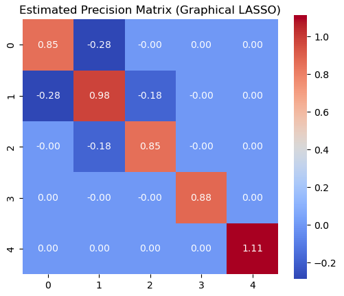 plt.figure(figsize=(6, 5))sns.heatmap(Theta_est, annot=True, fmt=".2f", cmap="coolwarm", square=True)plt.title("Estimated Precision Matrix (Graphical LASSO)")plt.show()