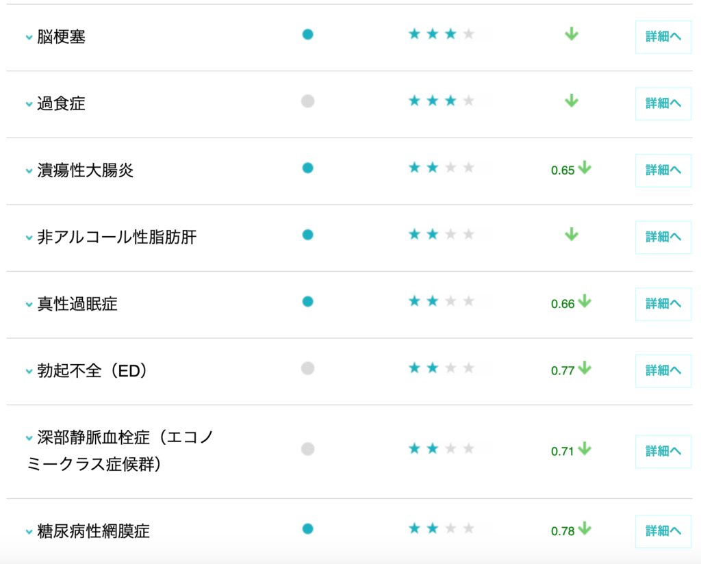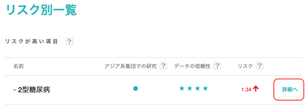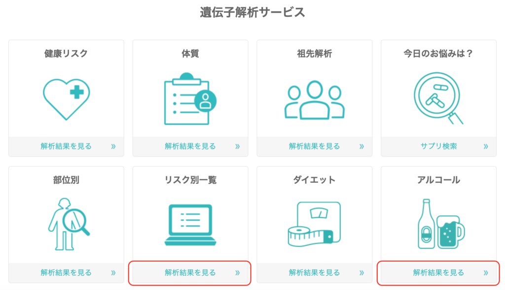 アルコールなどは、「リスク別一覧」の内容に入っていないので、別途クリックをして結果を閲覧するのが良いと思います。