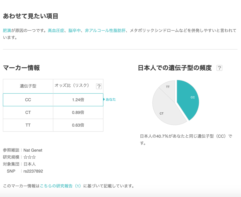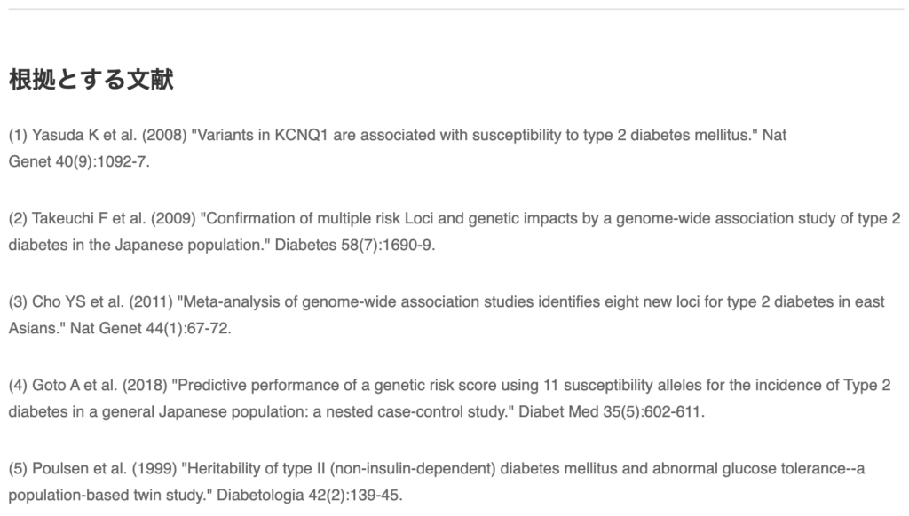 そして、判定基準に使われた変異(SNP)のレファレンス番号(rs番号)について詳しく載っています。