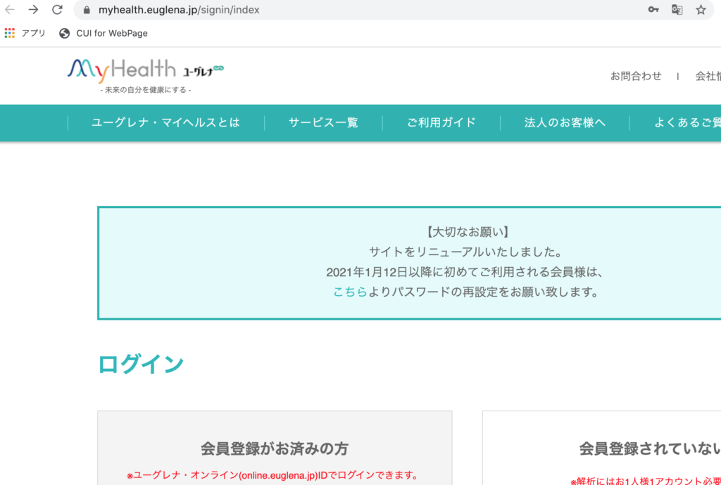 まずは、ユーグレナマイヘルスのログインのページにアクセスします。