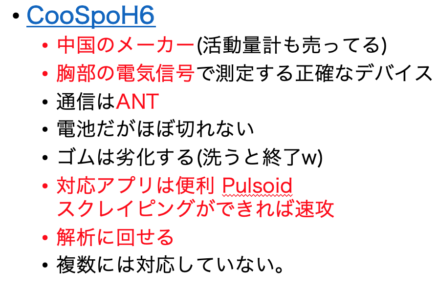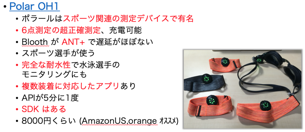 心拍と加速度に特化しており、BluetoothもANT+で遅延が限りなく無視できる程度になっており、また6点の緑色の光による正確な測定値が魅力的です。
