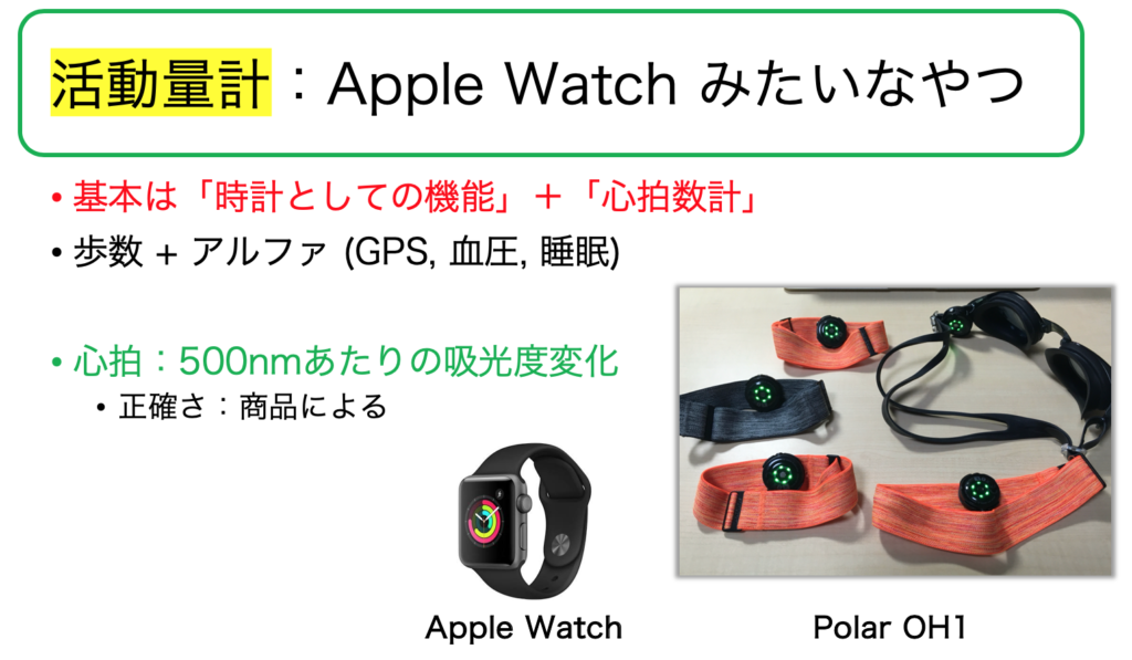 色々ありますが、最近では「活動量計」という名前の腕時計+αのようなデバイスを思い浮かべて頂ければ良いかなと思います。