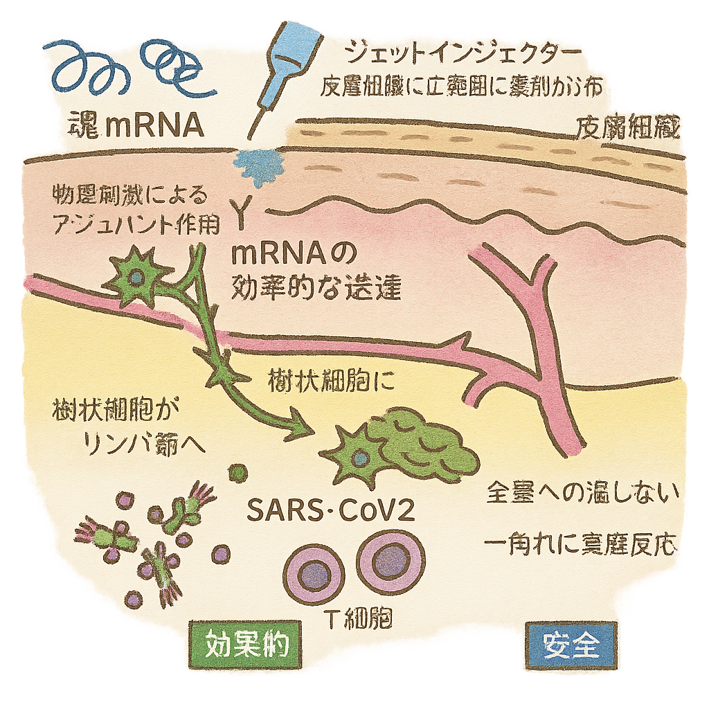 当初mRNA医薬品は不安定なため低温で保管しLNPに包む必要があると言われていましたが、LNPに包まずとも裸のmRNAの溶液を風圧を利用して経皮的に免疫細胞へ送達可能であることが報告されています。